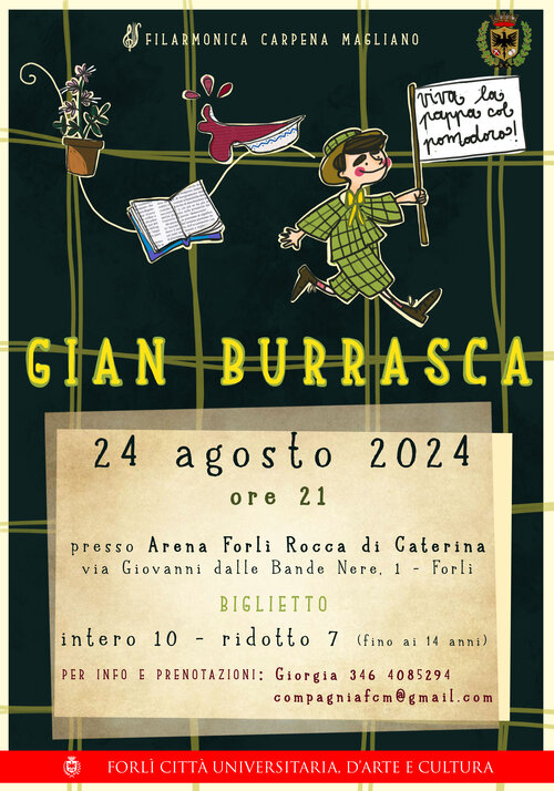 Sabato 24 agosto alle 21.00, presso l'Arena Rocca di Caterina, la compagnia teatrale Filarmonica Carpena Magliano presenta lo spettacolo Gian Burrasca.