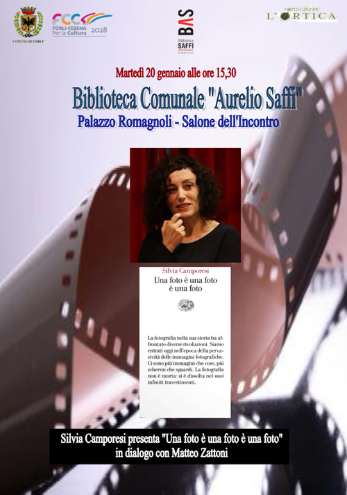 Martedì 20 gennaio ore 15,30 alla BAS, nel Salone dell'Incontro di Palazzo Romagnoli (Via Albicini, 12 – Forlì), Silvia Camporesi presenterà il suo libro “Una foto è una foto è una foto” (Einaudi 2025) in dialogo con Matteo Zattoni.