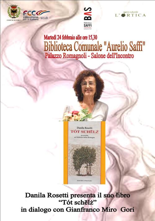 Martedì 24 febbraio ore 15.30 alla BAS, nel Salone dell'Incontro di Palazzo Romagnoli (Via Albicini,12 – Forlì), Danila Rosetti presenterà il suo libro “Tót schēlż” un poema nel dialetto della Romagna (Società Editrice Il Ponte Vecchio 2025) in dialogo con Gianfranco Miro Gori.