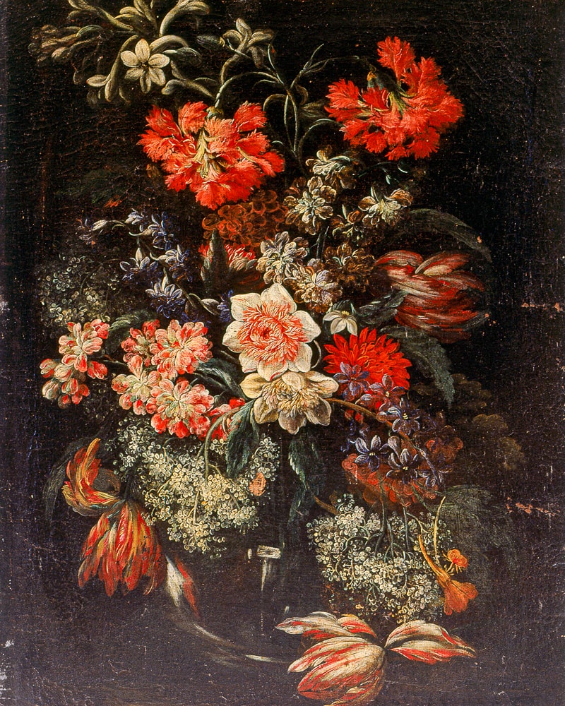 L’opera più emblematica della sala è la “Fiasca con fiori”, donata alla Pinacoteca civica di Forlì grazie al lascito del Conte Pietro Guarini. Si tratta di una delle “nature morte” più discusse della storia dell’arte, la cui paternità non può dirsi ancora convincemente conclusa. Sembra che sia stata realizzata dal Maestro della Fiasca tra il 1625 e il 1630 copiando il modello dal vero. Tutti i fiori (iris, gladioli bianchi e purpurei e stella di Betlemme) hanno un significato che va ricondotto alla figura di Cristo.