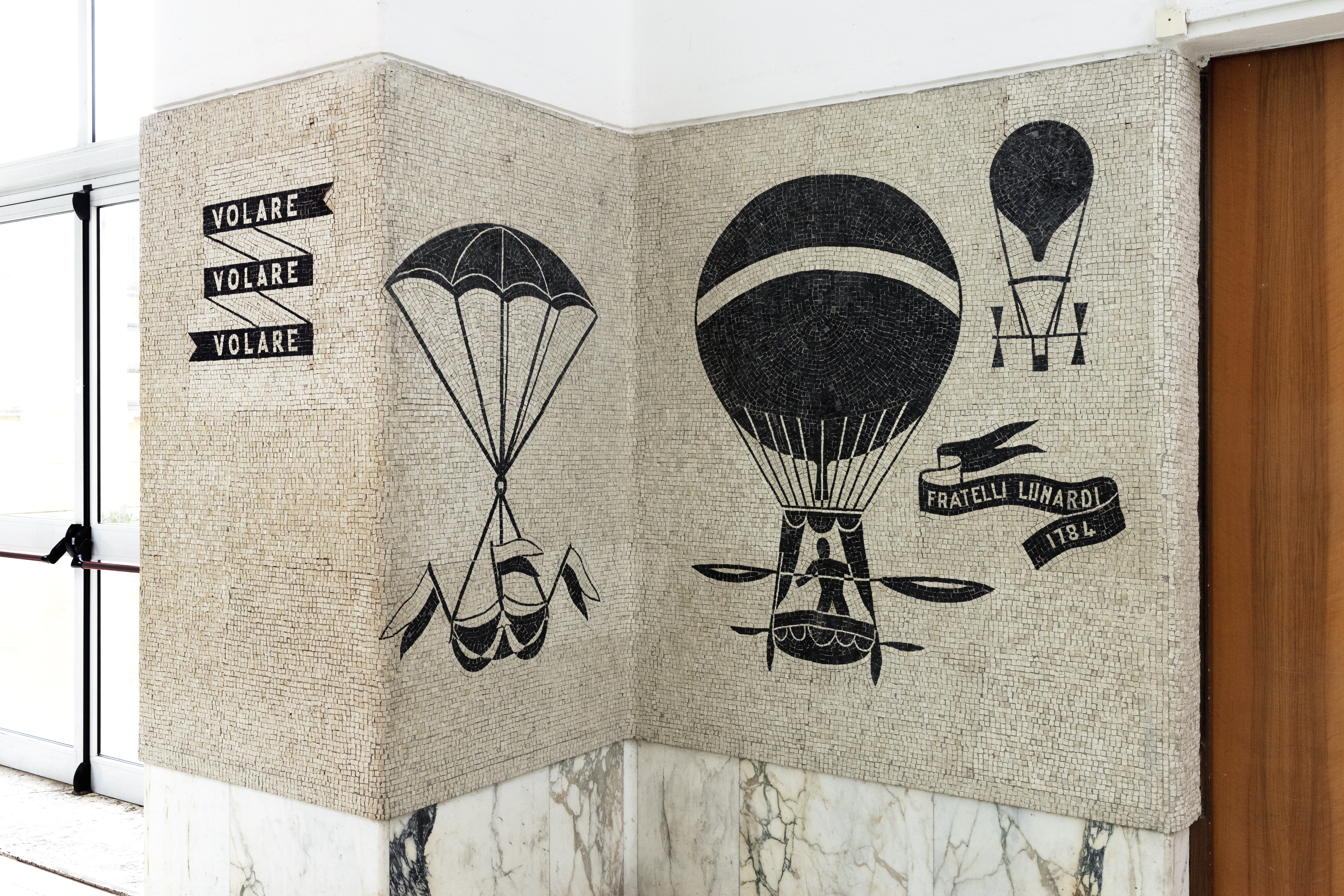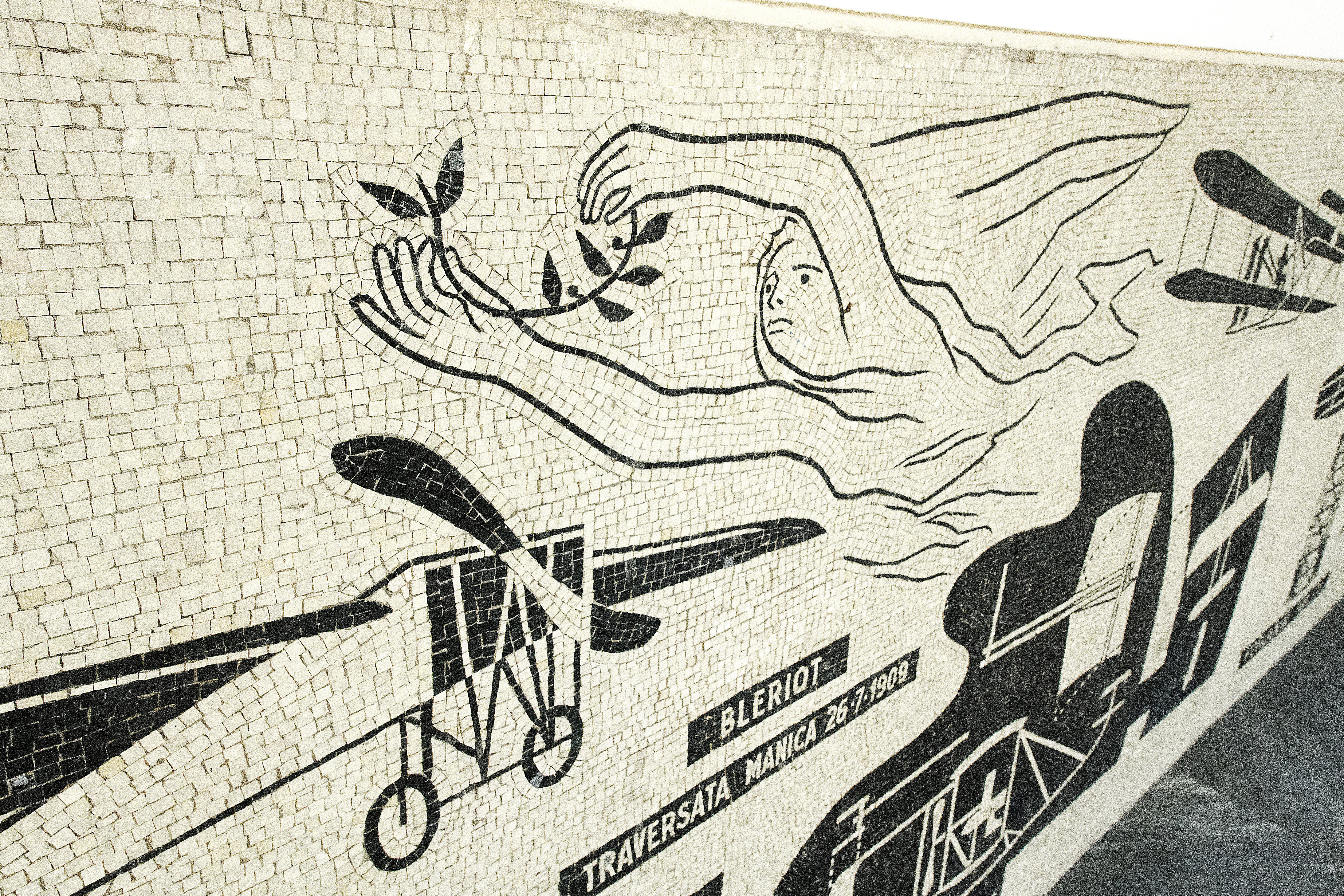 102 metri linerari di mosaici dedicati alla storia del volo: questo è il racconto che si svela lungo le pareti del quadriportico dell'ex Collegio Aeronautico.